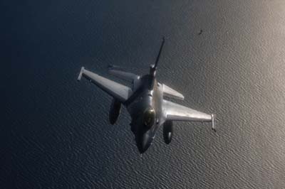&The four Turkish F-16C/D Fighting Falcons’ were due at 08:10. At 08:07 the first aircraft appeared, a two-seat F-16D (89-0043) and flown by the flight leader callsign ‘Izmir 41’ in less than three minutes had received 6,000 pounds of JP-8 fuel. The other Turkish aircraft three single-seat F-16C’s, each took 5,000 pounds of fuel before they were all on their way to the target by 08:23.