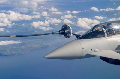 | Typhoon IPA.5 (ZJ700) of BAE Systems c/s 'Tarnish' from Warton, in refuelling trials at 20,000 feet over North Sea (AARA 6) and later high level refuelling trials with TAC towline at 35,000 feet (EGD323). |