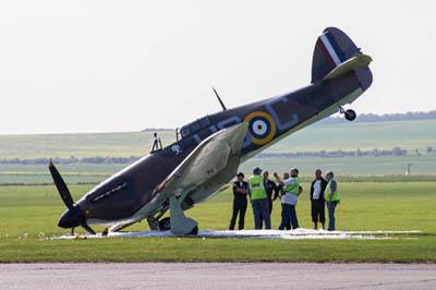 Unfortunately the event got off to a very bad start. At precisely 8:59 a.m., as recorded on my digital camera, the Battle of Britain Memorial Flight's Hurricane, flying from RAF Coningsby, had an under-carriage collapse on landing. I had previously checked in at the media centre and was just beginning to walk along the flight line when the Hurricane 2C (LF363 'US-C') over flew the field and turned left to come into land. Everything looked quite normal. It was only after touching down, did the pilot realise that his starboard under carriage was not locked in position. He appeared to skillfully bring the much-loved World War Two fighter to rest with the minimum amount of damage. The right wing only dropped to the grass field as it curved towards, but some 100 yards short of the crowd line. The propeller was almost stopped at this time and only the propeller's tips struck the ground as it came to rest with a cracking noise. The pilot was swiftly out of the cockpit and away to safety in seconds, already assisted by an alert member of the Duxford ground staff. Numerous fire engines arrived within seconds. But only a small amount of foam was sprayed initially as a precaution. Over the next few hours the Fire Service and a heavy lift crane which was already on site, was used with the aid of air bags to lift the sorry looking plane to its 'feet'.