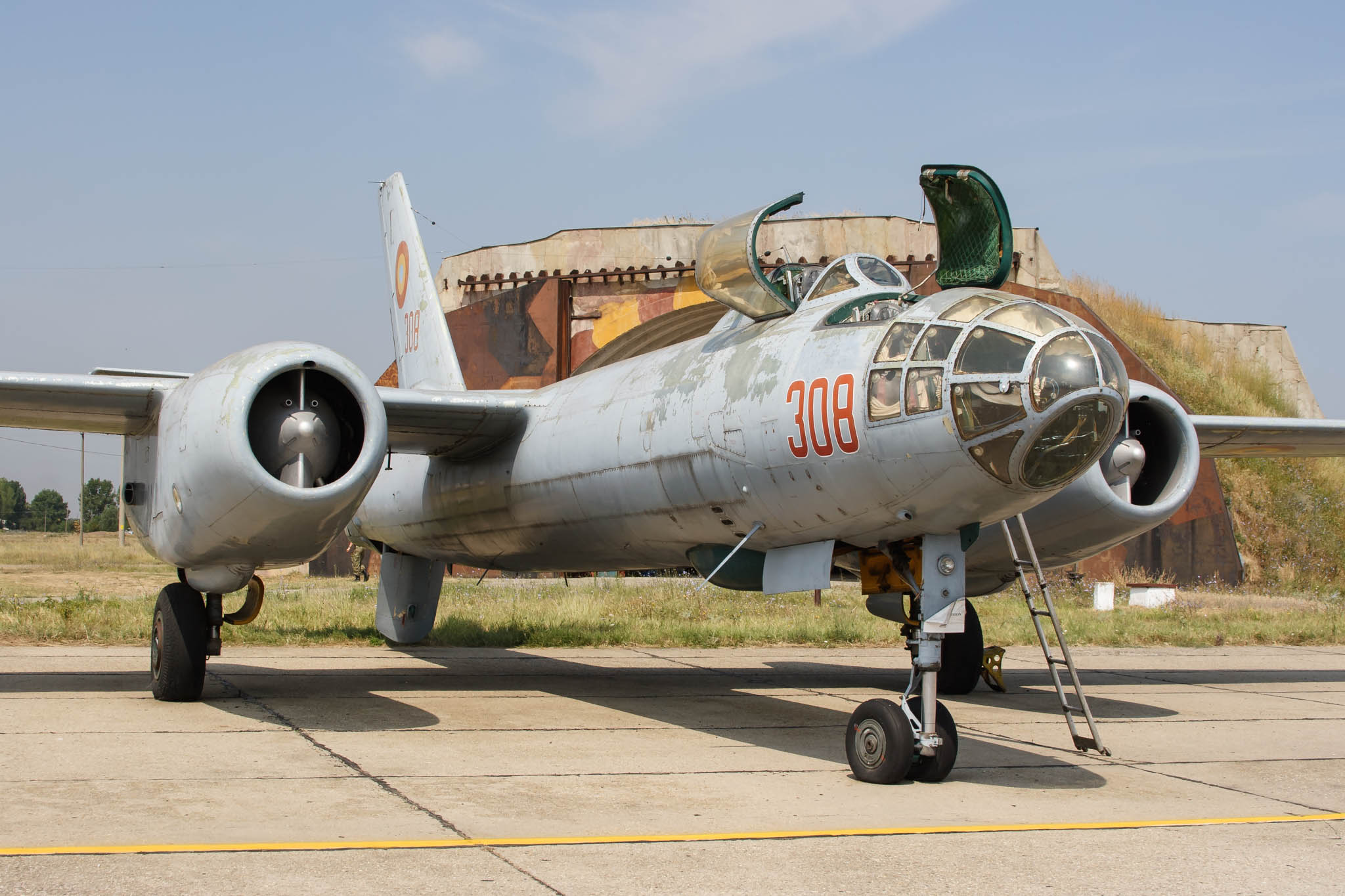 | Left to right: Harbin/Hong H-5 (308) one of six stored here, the rest were at the far end. The Hong-5s were in service with 38 Reconnaissance Squadron (Escadrila 38 Reconuastere) from Air Base 86 at Borcea-Fetesti from 2000 till the last flight on August 26, 2001. Another four of the interesting aircraft were found at
