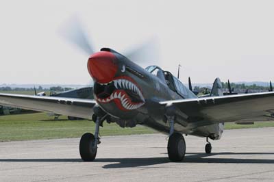 | Left to right: Curtis Hawk 75A-1 (No.82 'X8-81') it is the only flyable ex L'Armée de l'Air Hawk in existence. It first appeared at Legends in 2005 following its restoration. Seen here in 2008. Vought FG-1D Corsair ('KD345 130', 88297 registered G-FGID) when appearing in 2008. Grumman F-8F-2P Bearcat (121714 'B-201' registered G-RUMM) in 2012. Curtiss P-40B Warhawk ('284' '18P' 41-13297 registered G-CDWH) in 2008. This aircraft is believed to be the only survivor from the attack on Pearl Harbour in 1941. It was eventually lost over Hawaii, the wreck was salvaged in 1985 and 1989. Restoration using parts from to other wrecks, was carried out by the Curtis Wright Historical Association and the Project Tomahawk of Torrance. With the restoration complete it flew once again in January 2007 and was shipped by TFC to the UK to appear at the 2007 Flying Legends show. |