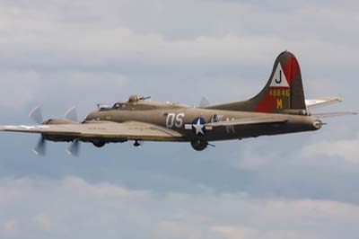 | Left to right: Boeing B-17G Flying Fortress ('42-97849' really 44-85734 registered N390TH) 'Liberty Belle' of the Liberty Foundation it headlined the 2008 show flying specially from the US. Hawker Sea Fury T.20 (WG655 '910' registered NX20MD) landing after a solo display by Stephen Grey in 2009. It returned to the UK in May 2009 after an absence of 20 years following an extensive restoration following a crippling accident due to an engine failure near Yeovilton when with the Royal Navy Historic Flight in 1990. P-51D-30 Mustang (44-74391 'MX-I' registered N351MX) with P-51D-20 Mustang (44-63864 '412016' registered NL98CF) 'Fragile but Agile' both of the Commanche Fighter's 'The Horsemen'. |
