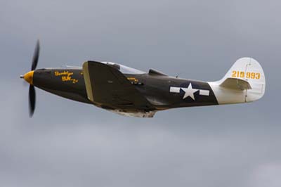 | Left to right: Curtiss (Republic) P-47G-10-CU Thunderbolt (225068 'W-D' / G-CDVX) 'Snafu' which arrived at Duxford in 2006 and was rolled out in June 2011. It did not fly at Flying Legends 2011 when this images was taken. North American P-51D Mustang (44-63684 'HL-W' /G-CBNM) 'Twilight Tear' of TFC which returned to Duxford where it was originally based during the World War Two with the 78th Fighter Group (USAAF) and in whose colours it has again been painted, seen here in 2003. Curtis P-40M Kittyhawk (43-5802 '49' / G-KITT) in 2005. Bücker Bü133c Jungmeister ('LG+01' / G-AYSJ) when with TFC in 2004, it was later sold. |