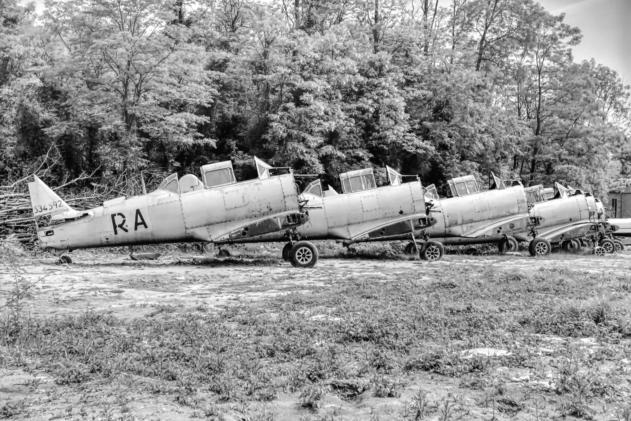 North American T-6G with what looks like a Bücker Bü181 Bestmann, in the undergrowth. |