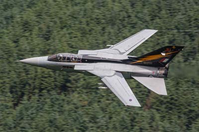 | Left to right: Second of pair Tornado GR.4 (ZA370 '004') unmarked but was last noted with 31 Squadron. The Tornado GR.4 pair diving in to the valley before a left turn before the lake. |