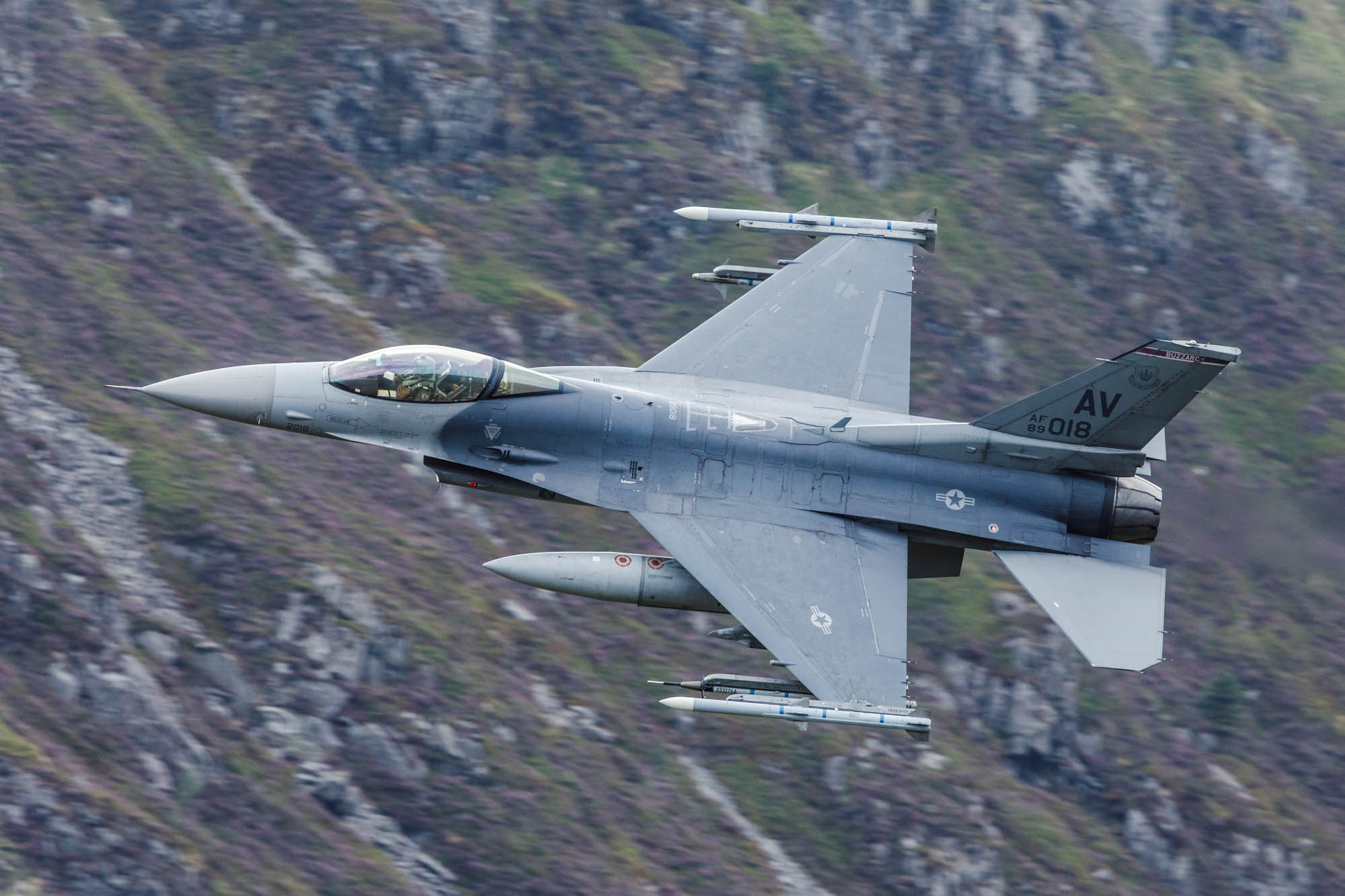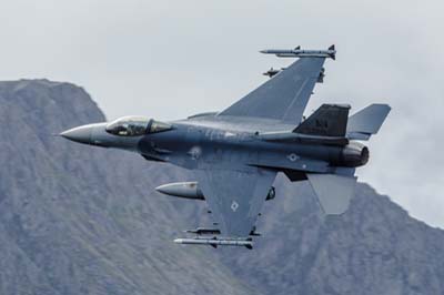 | Left to right: F-16CM Fighting Falcon (89-2018 'AV') callsign 'Bones flight' of 510th Fighter Squadron. |
