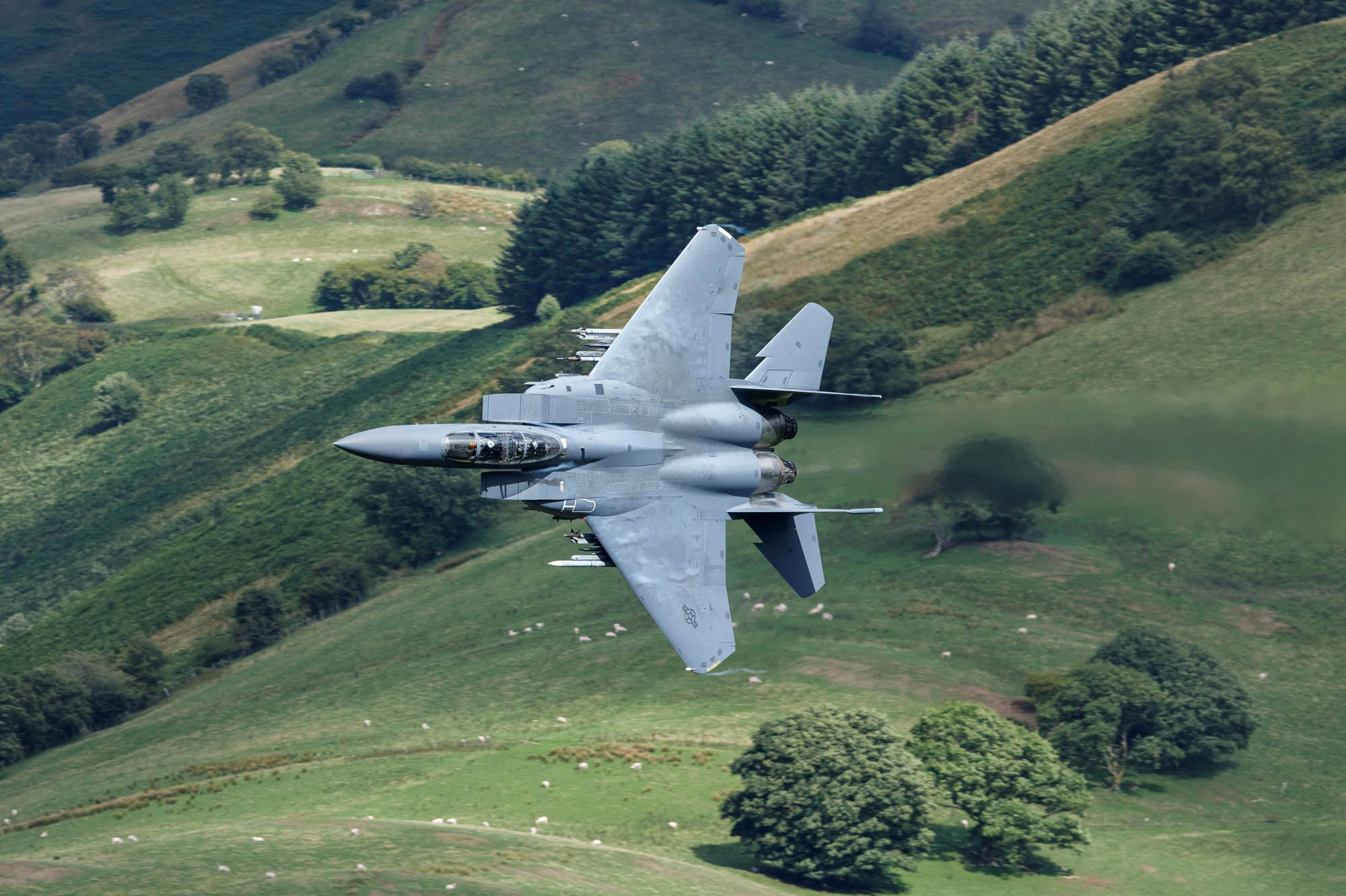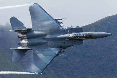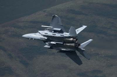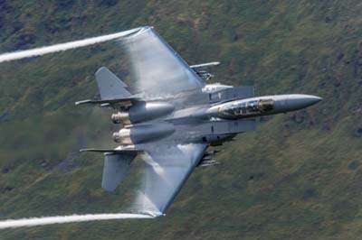 Tuesday July 31, 2018 Every so often the conditions in the hills are perfect for low level photography, today was one of those mornings. It was damp, really damp and the sun was shining through some small gaps in the clouds. 'Stout flight' call up on the scanner, inbound. I am on a south facing hill and the light would be tricky. Shutter speed and -1 stop exposure compensation are set. Then around the corner comes F-15E Strike Eagle (01-2004), callsign 'Stout 91'. I just had to pan perfectly and a great image should be mine. I pan really well and have a great sequence of images with changing 'cloud' formations over the wings.