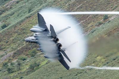 Wednesday August 29, 2018 With a good forecast I set off for Wales, however the Loop can generate its own weather and on arrival the mist enveloped the valley touching the road. A heavy drizzle continued until the mist suddenly lifted at 11:30. By mid-day it ws bright and the cloud base was 1,500 feet or so. First F-15Es then F-15Cs made passes with each jet generating its own cloud in the very damp air.