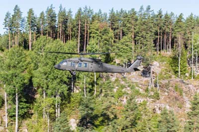 | Hkp16 Black Hawk (161237 '12') passing over a telephone line hidden between the trees. |