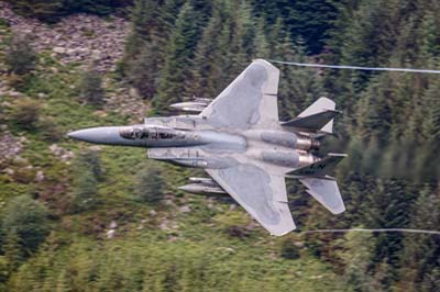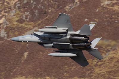 | Damp days will produce these vortices or 'streamers' trailing from an F-15E Strike Eagle's wing tips and upper surfaces From the top of the valley this was one of a sequence of images taken with a DSLR x1.6 sensor + Canon EF 300mm f2.8L lens in October 2009. |