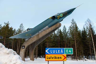 Left to right: SAAB SH37 Viggen (37927 '63') F21 Wing. Still owned by the Swedish Air Force it is expected to be removed from this location to be mounted on a round-about nearest to the airbase entrance at Luleå. |