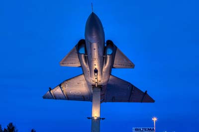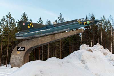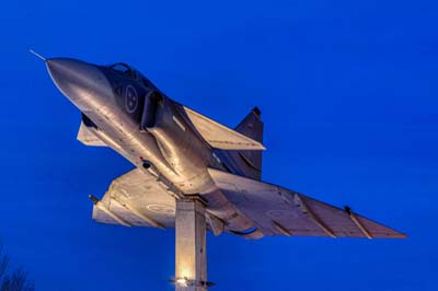 | Left to right: SAAB S35E Draken (35949 '65') F21 Wing. Pole mounted outside the entrance to the civilian side of Luleå (LLA) airport. It has been more recently restored and remounted on its pole. It has illuminated navigation lights and I am told the cockpit lights up once an hour. |