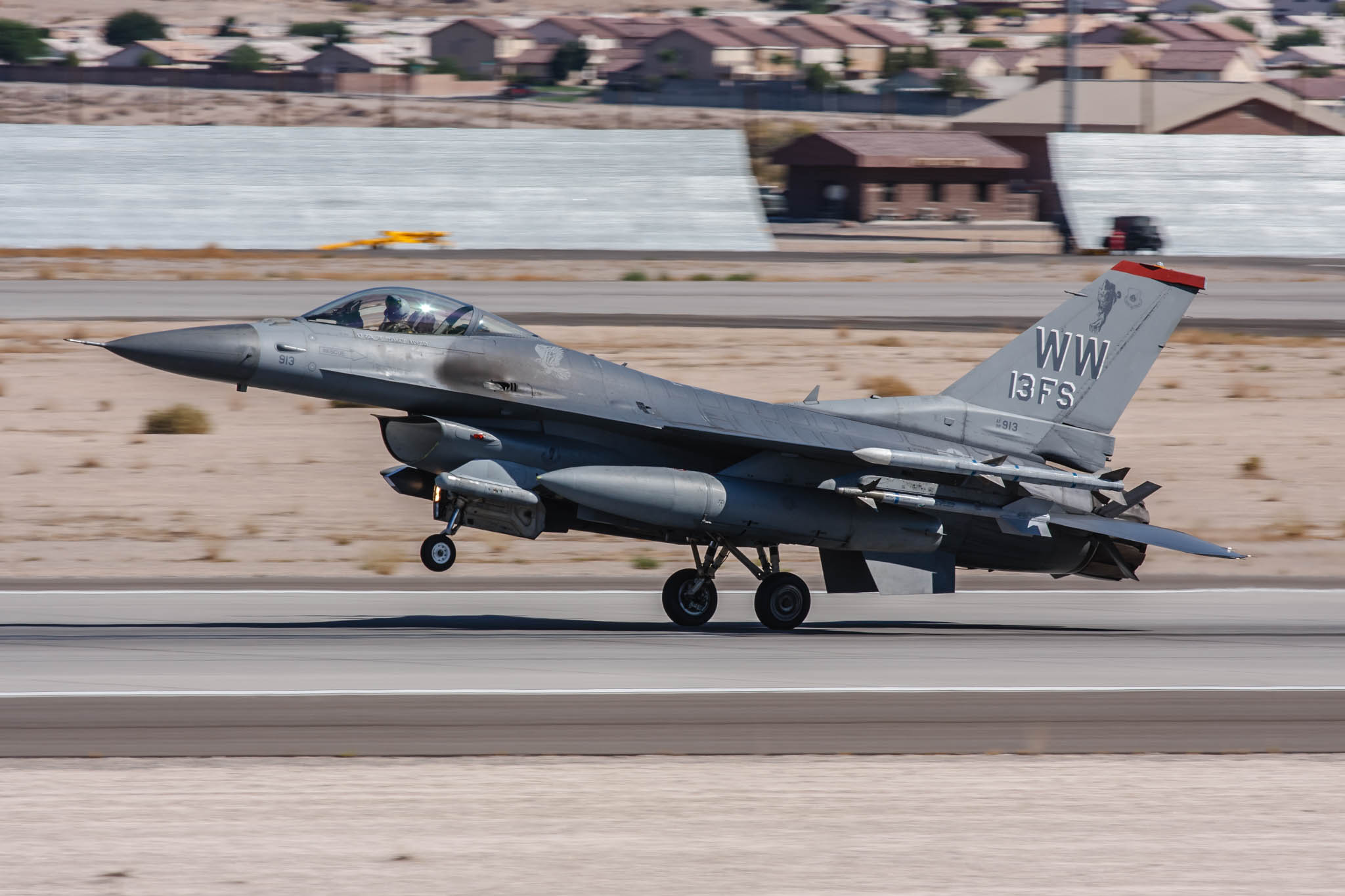 F-16CJ Fighting Falcon (92-3913 WW marked '13 FS') departing Nellis