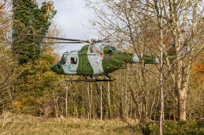 | Lynx AH.7 (XZ641 'A') of 671 Squadron descending in to a confined landing area of Autumn colours in October 2012. |