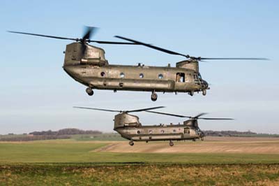 | Left to right: Chinook HC.4s (ZA705 'AN' and ZD981) Pegasus Flight of Odiham Wing (7, 18 and 27 Squadron). |