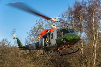 | Bell 212 AH.3 (ZK067 'B') using callsign 'Army Air 760' of 671 Squadron deep in the forest. |
