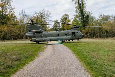 Chinook HC.4 (ZA720 'AW') with 27 Squadron deaprting the Pennings 'walled garden' in October 2017. |