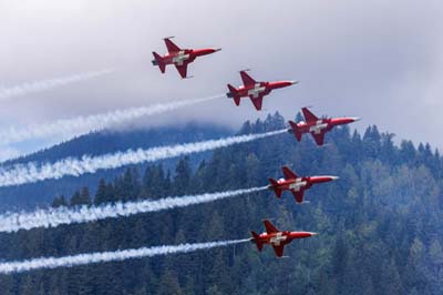 The only vintage jet was the Hunter Mk.58 known as 'Papyrus' which flew three times. The Swissair marked Douglas DC-3 Dakota arrived and also later displayed flying up and down the tight valley with ease, turning within the confines of the valley itself. It was joined by three attractive US registered former RCAF Beechcraft CT-128 Expeditors. |