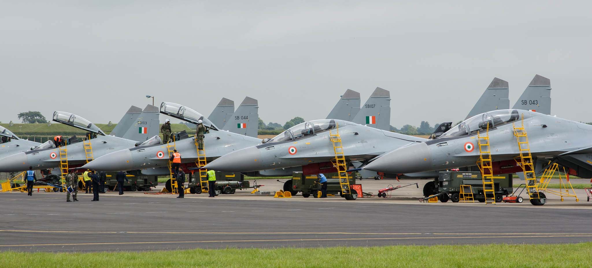 | The line up of six Sukhoi Su-30MKI 'Flanker-Hs of 30 Squadron IAF |