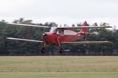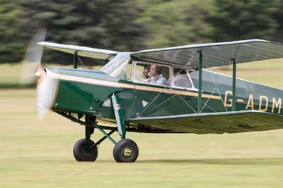 A Leopard Moth (G-AIYS), Fox Moth (G-ACEJ) and the Puss Moth (G-AAZP) made a formation fly past before the Hawk Speed Six (G-ADGP) operating from White Waltham zoomed across the airfield. The Flying Dutchmen formation of a Piper Cub (PH-VCY) and two Tiger Moths (G-AJHS and G-ADGV) were next. The incredibly agile Fieseler Storch (G-STCH 'GM+AI') demonstrated a STOL landing with a roll out of 50 yards. Chipmunk (G-ALWB) performed solo aerobatics before a Dragon Rapide (G-AGJG) operating from Duxford made a few passes. The Tiger Nine team with Tiger Moths; (G-ACDA, G-AHAN, G-AIXJ, G-ANEM, G-ANEN, G-ANFM, DE470 (registered G-ANMY), G-AOBX and G-APLU concluded the air show with a symmetrical formation not made easy by the prevailing stiff breeze which had prevented Junkers (G-BUYU) and two SE.5A replicas (G-BDWJ and G-CCBN) from attending. |