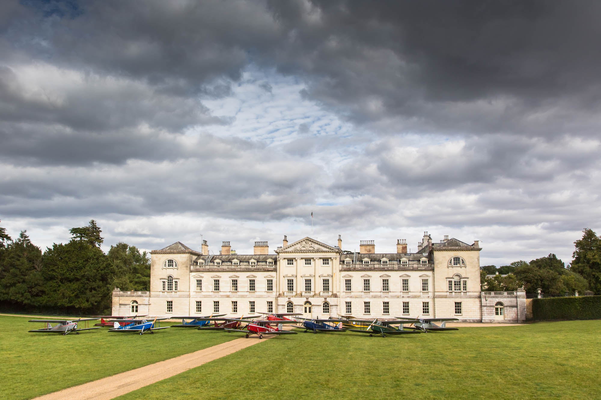 To commemorate the first flight of the DH.87 Hornet Moth it was decided to invite the owners of the attending aircraft to a photo shoot in front of Woburn Abbey itself. During the previous week scaffold tower was erected to the right of Woburn Abbey's front drive. So on the appointed hour of 16:00 on the first day of the rally, the pilots of the eleven Hornet Moths started their engines and started to taxi west to the far end of the grass airstrip and then along one of the parks roads.