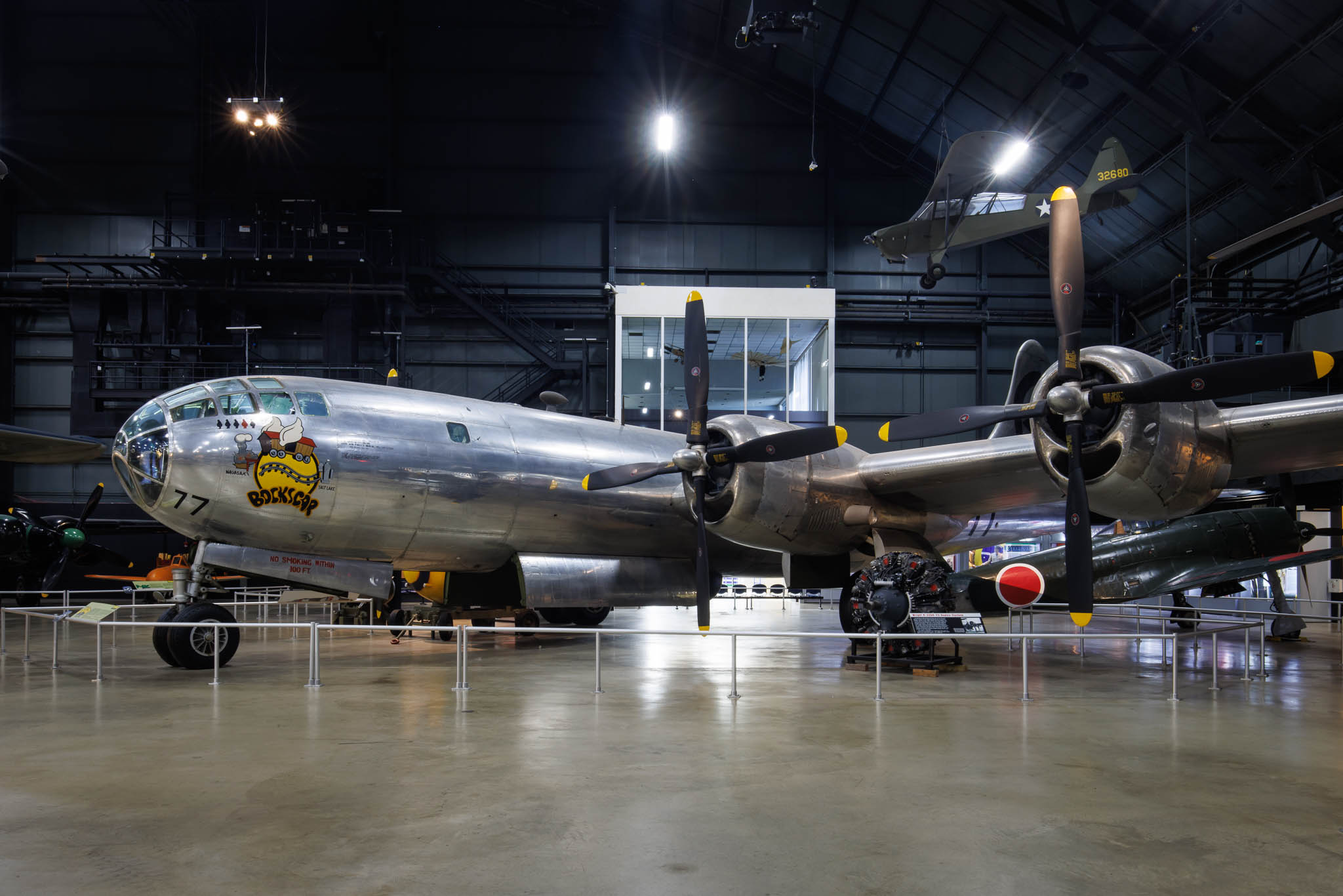 Left to right: Boeing B-29 Superfortress (44-27297 '77') 'Bockscar' built by the Glenn L. Martin Co. at Omaha and was delivered to the 393rd Bomb Squadron at Wendover Field in the Utah on April 19, 1945. Dropped the 'Fat Man' atomic bomb over Nagasaki, Japan which ulitimately ended World War Two.