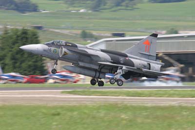 | The best solo display was by a SAAB JA37 Viggen of the Swedish Air Force (Flygfapnet F 21 37411/11), complete with special markings as shown on its undersides. The Viggen with its unmistakable double delta wing, gave an impressive short take-off with afterburner and to finish an equally impressive short landing, using engine thrust reversing. |